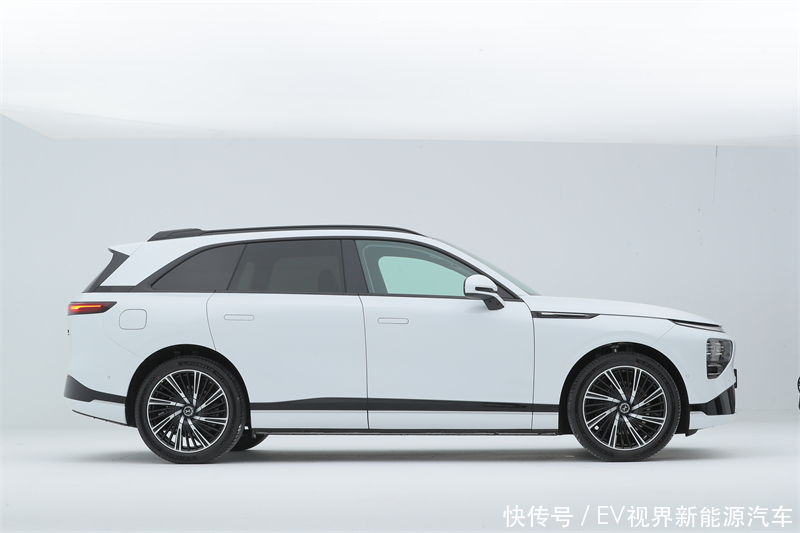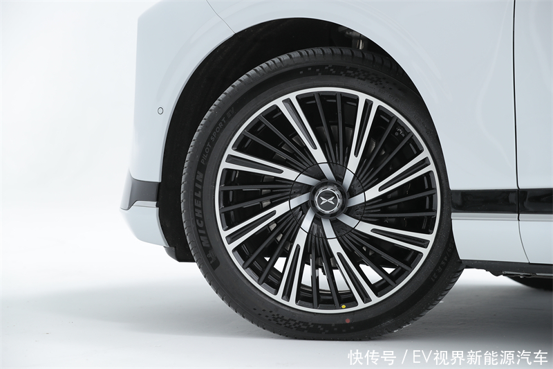 车身侧面小鹏G9的设计与传统中大型SUV有着很大不同,一条水平高腰线贯穿车身,将整车在纵向上做黄金比例分割。车侧A柱的设计比较靠后,修长的机盖以及长车颈、短前悬、长后悬、加上21英寸大轮圈,形成一种类似于后驱轿跑的既视感,共同营造出整车如游艇般的优雅与豪华感。
