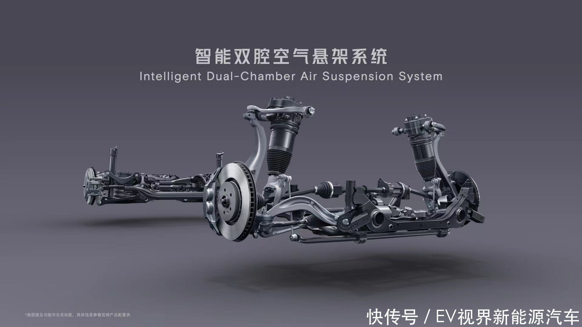 小鹏G9采用前双叉臂+后多连杆的组合,并搭载了智能双腔空气悬架,具备5挡调整,将实现主动探测路况及特定地点标记记忆等功能。